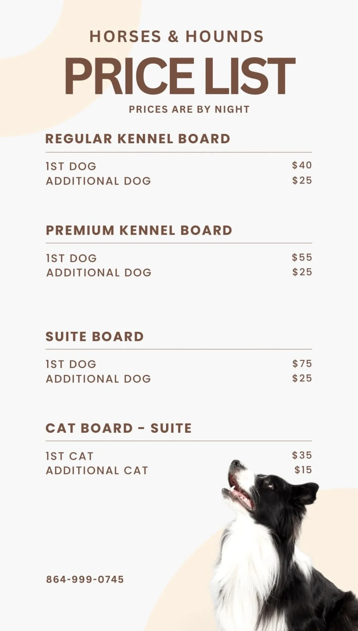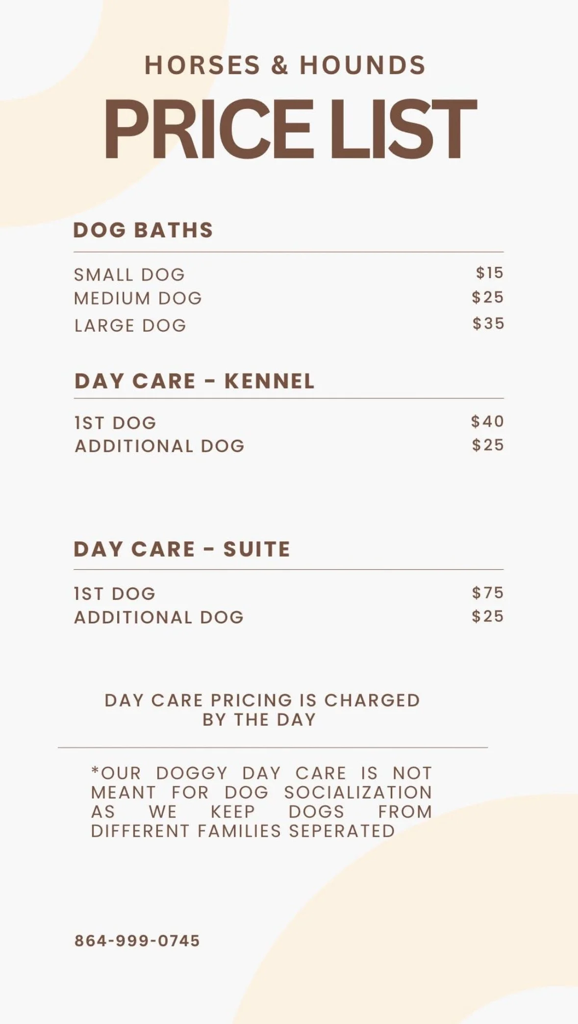 We offer many different services such as baths, doggy daycare, overnight boarding, transport, and drop ins to your home/farm. If you don’t want to book online you can text or call (864)-999-0745 to get your reservation scheduled.